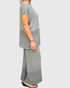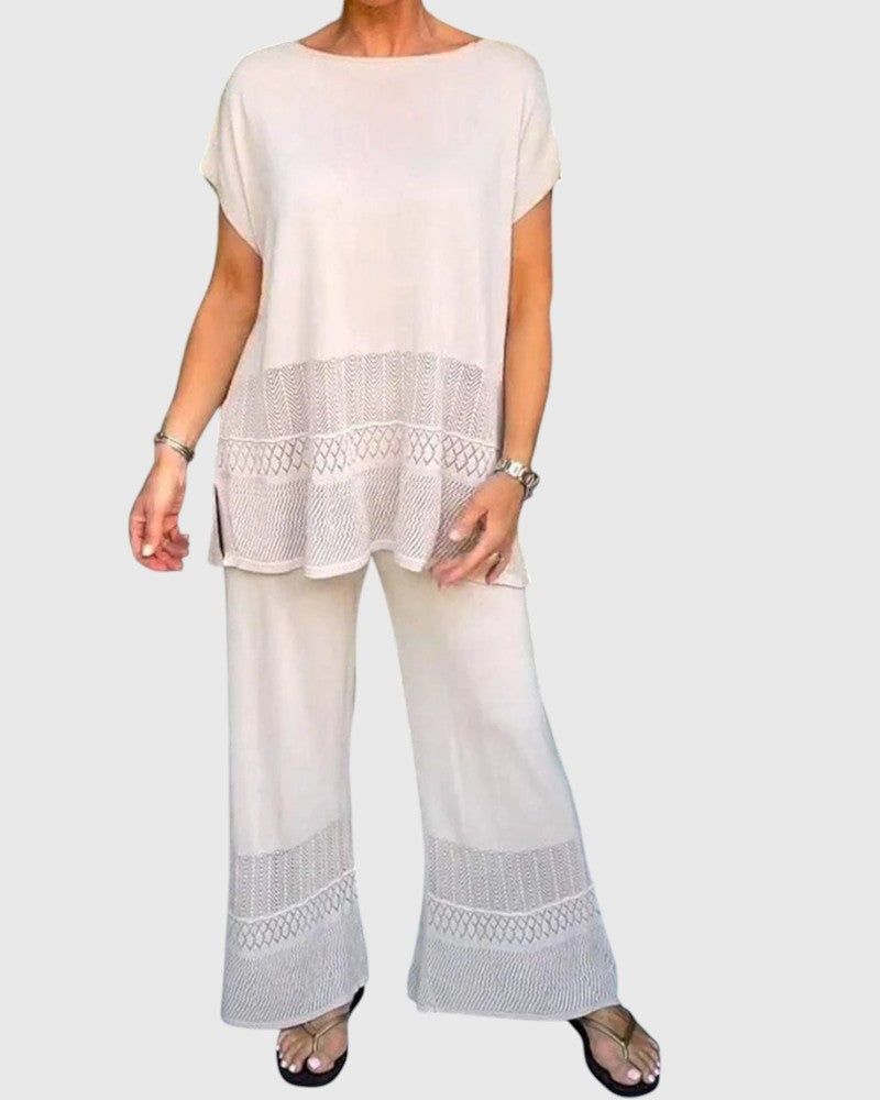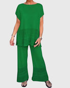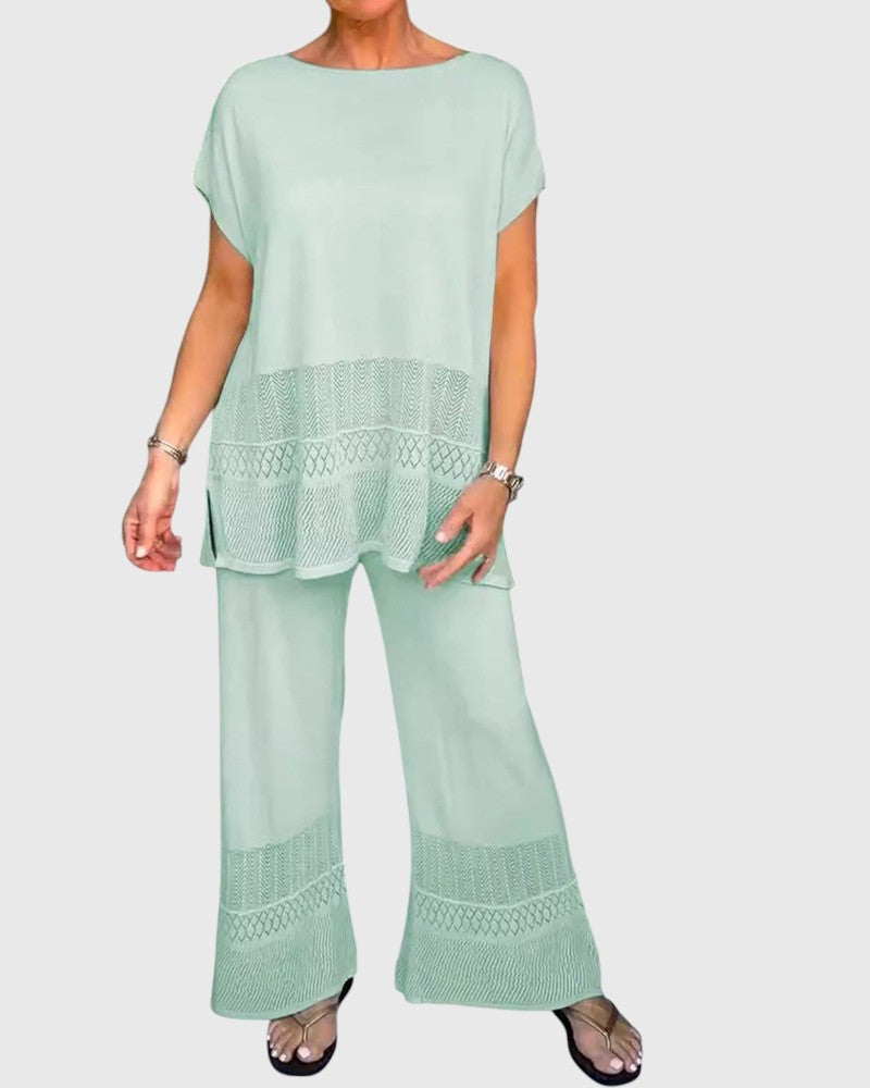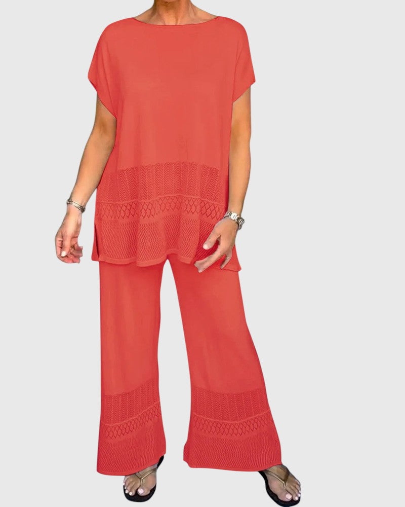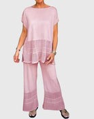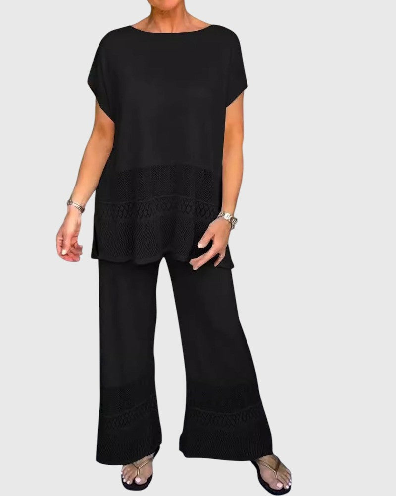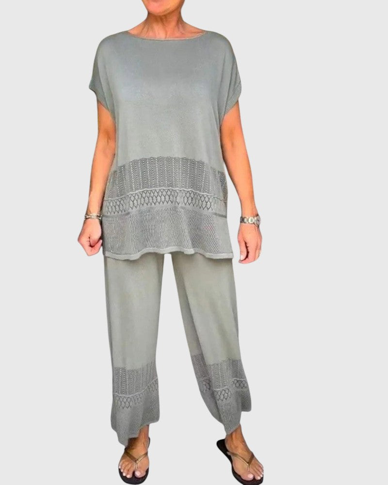 חולצה קלילה עם גזרה רכה ומכנסיים בגזרה רחבה ליצירת מראה נשי, רגוע ומתוחכם. מושלם לבית, לטיול או ליום רגוע בעיר.
