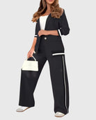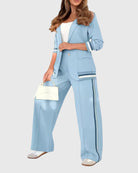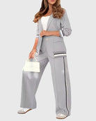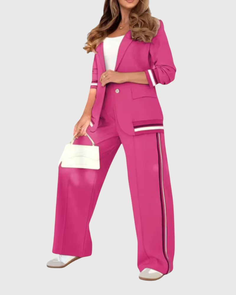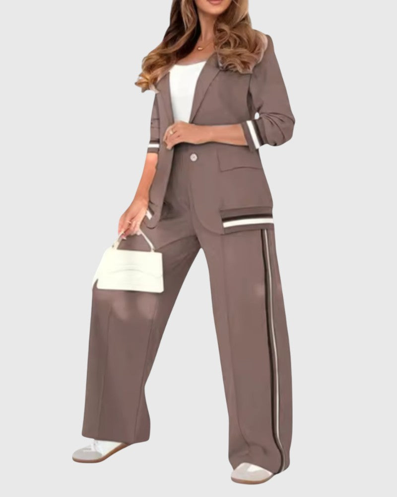 סט חליפה אלגנטי ומעודכן שמעניק מראה מוקפד ונוח. כולל בלייזר מחויט יחד עם מכנסיים רחבים, עם פסי דקורציה שמוסיפים נגיעה מודרנית. מתאים לשימוש יומיומי, לאירועים או למראה מקצועי.