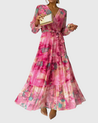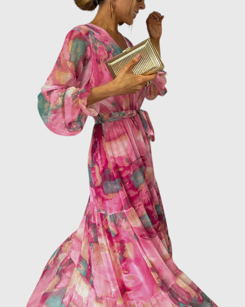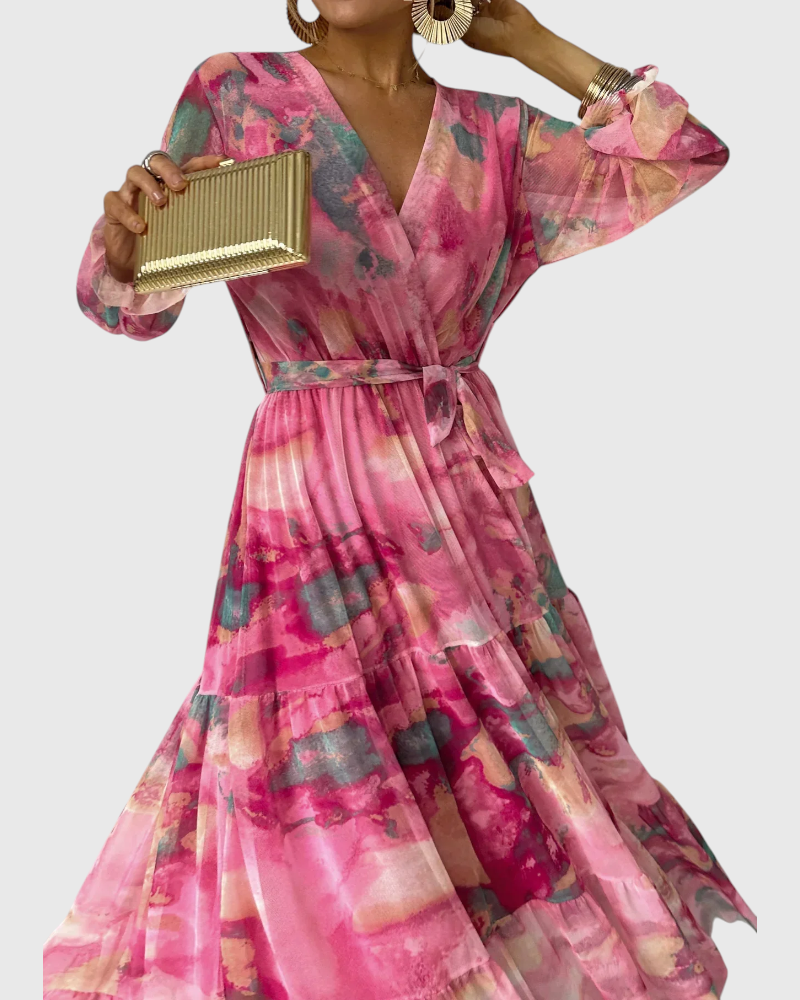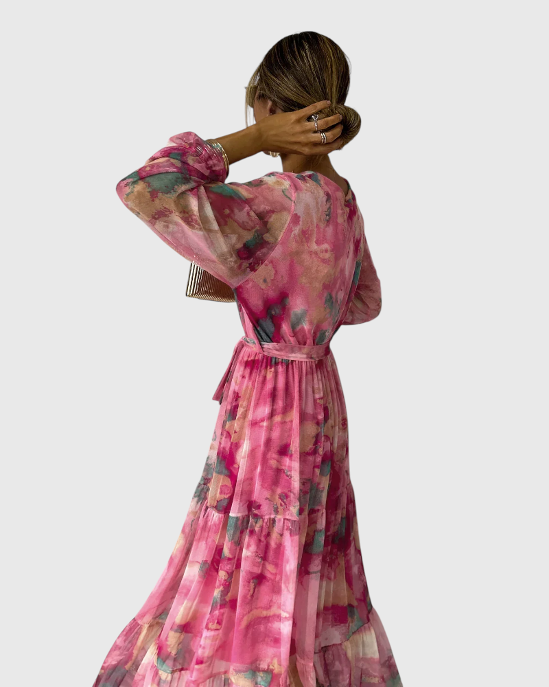 שמלת מקסי זורמת עם הדפס בהשראת צבעי מים בגוונים ורודים עזים. בעיצוב מעטפת וחגורה מחמיאה, היא מדגישה את הנשיות ומתאימה לערבים אלגנטיים ולאירועי קיץ מיוחדים.