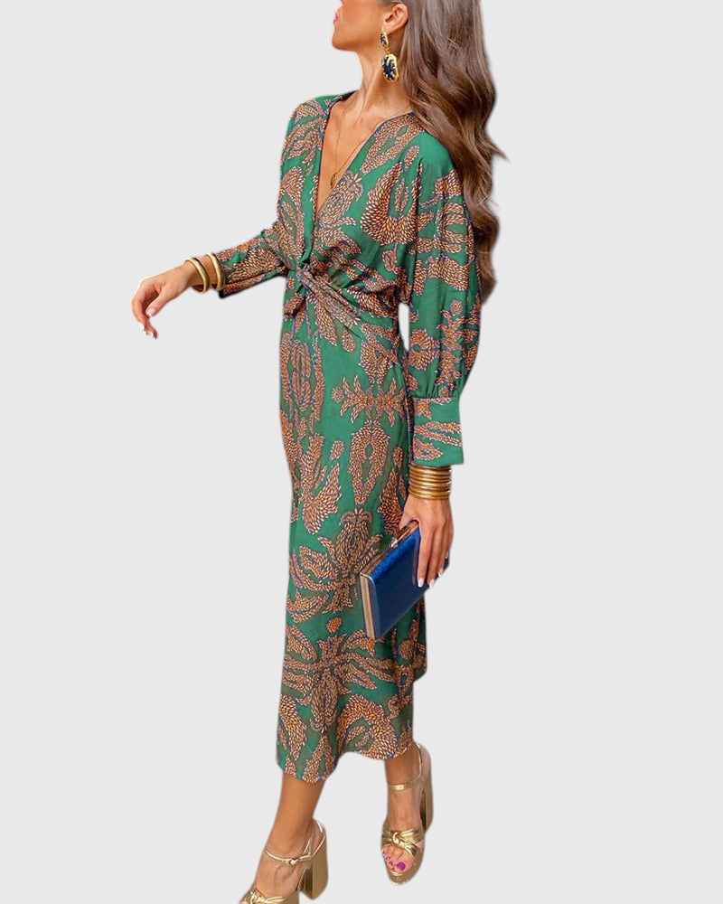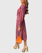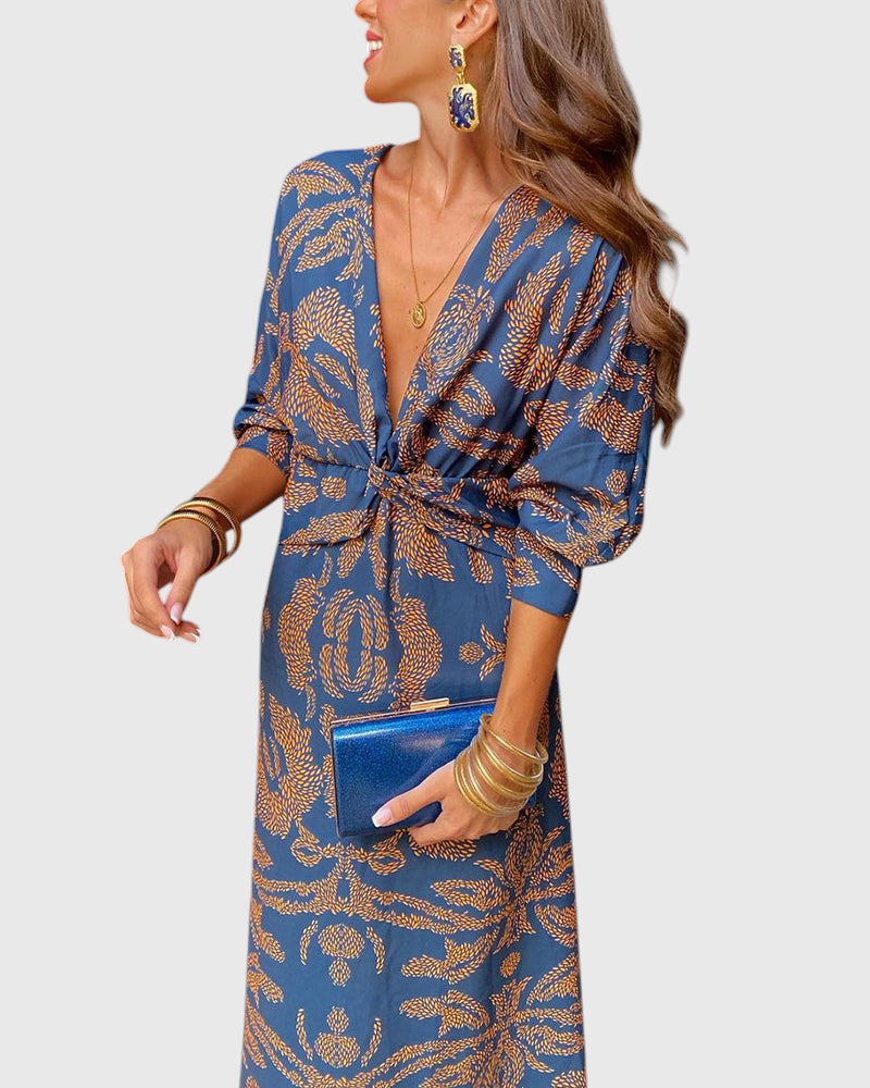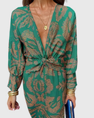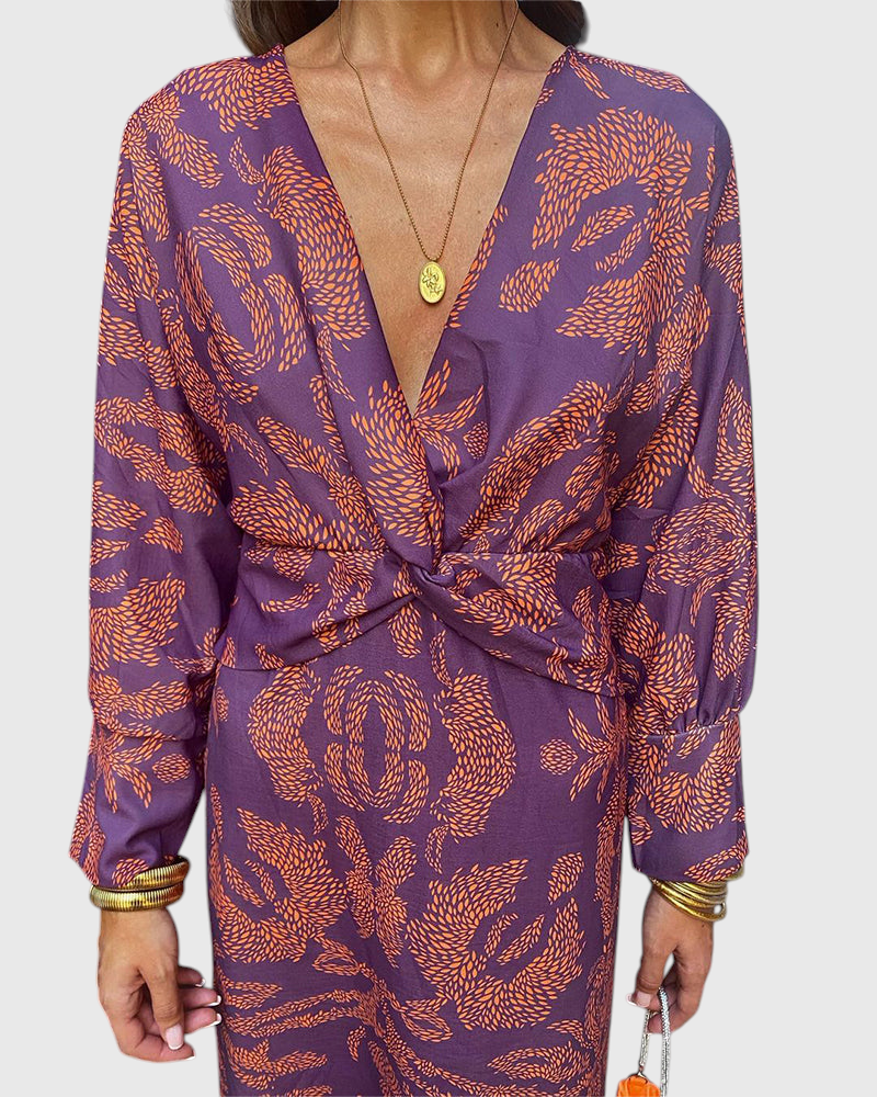 שמלת מידי מתוחכמת עם מחשוף עמוק ובסיס כחול כהה המשובץ בהדפסי פרחים בגוון ברונזה. הקשירה במותן יוצרת מראה מחמיא ונשי, מושלם לאירועי ערב וגם לבילויים יומיומיים אלגנטיים.