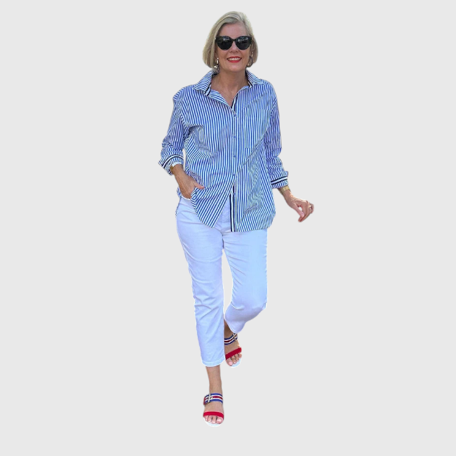 הוסיפי טאצ’ קלאסי לארון שלך עם חולצת כפתורים מפוספסת. הגזרה הנינוחה מתאימה לבילויים יומיומיים, טיולים שמשיים או כפריט עליון לשכבות.