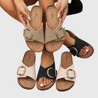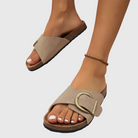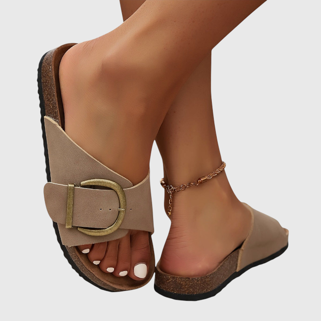 סנדלי סלייד אופנתיים ונוחים לשימוש יומיומי. האבזם הבולט מוסיף נגיעה ייחודית למראה תוך שמירה על תחושת נוחות ורוגע לאורך כל היום.