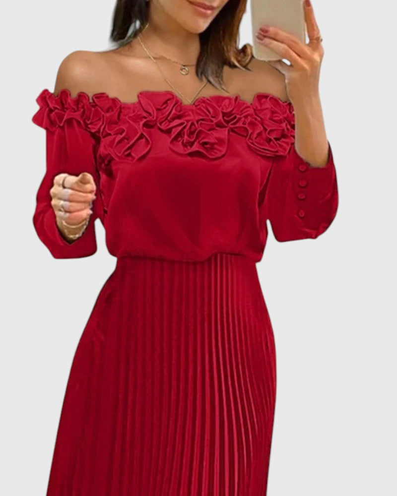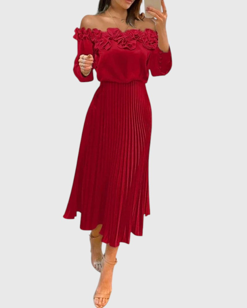 שמלה מרשימה שנועדה לשדר אלגנטיות וביטחון. עם מחשוף מעודן וחצאית פליסה זורמת, היא הבחירה המושלמת לאירועים מיוחדים.