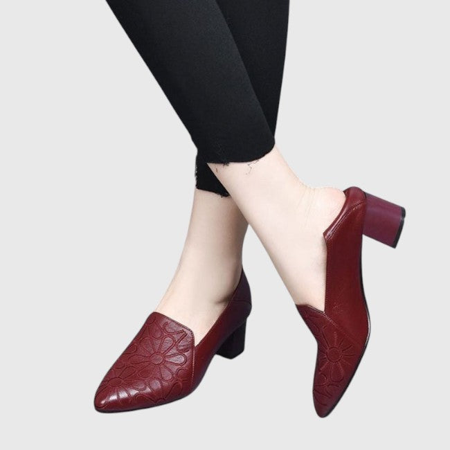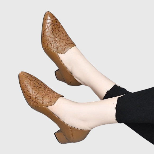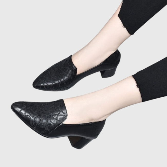 נעליים אלגנטיות וקלאסיות, המיועדות לנשים שמחפשות שילוב של סטייל ונוחות. עם טקסטורת פרחים עדינה ועקב נמוך ותומך, הן מושלמות גם לעבודה וגם לערב.