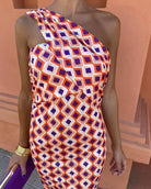 שמלה עם כתף אחת זו בולטת בזכות הסילואט המותאם, הקו הא-סימטרי ואורך עד הקרסול. ההדפס הגיאומטרי בעיצוב כולל מוסיף אופי וממיר כל צעד לביטוי של נשיות מודרנית ומעודנת.