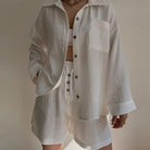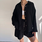 סגנון קליל: עליון עם כפתורים ומכנסי שורט עם חוט מותן יוצרים מראה אחיד ואלגנטי.