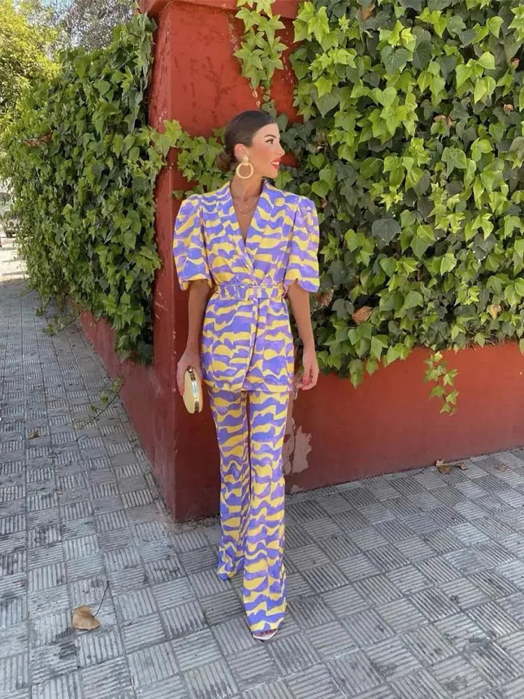 הסט בן שני החלקים כולל בלייזר עם חגורת מותן, שרוולים נפוחים וחשיפה עמוקה בצורת V. המכנסיים המותאמים משלים את המראה ויוצרים סילואט מובנה אך זורם – מושלם לכל הזדמנות שבה אתה רוצה להרשים.