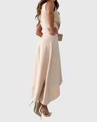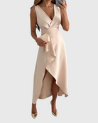 שמלה אלגנטית בצבע שמפניה עם מחשוף V עמוק וחיתוך א-סימטרי ייחודי. הפרטים המדורגים בצד מעניקים תחכום ותנועה, מה שהופך אותה לבחירה מושלמת לאירועים מיוחדים ולערבים חגיגיים.