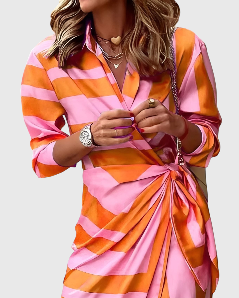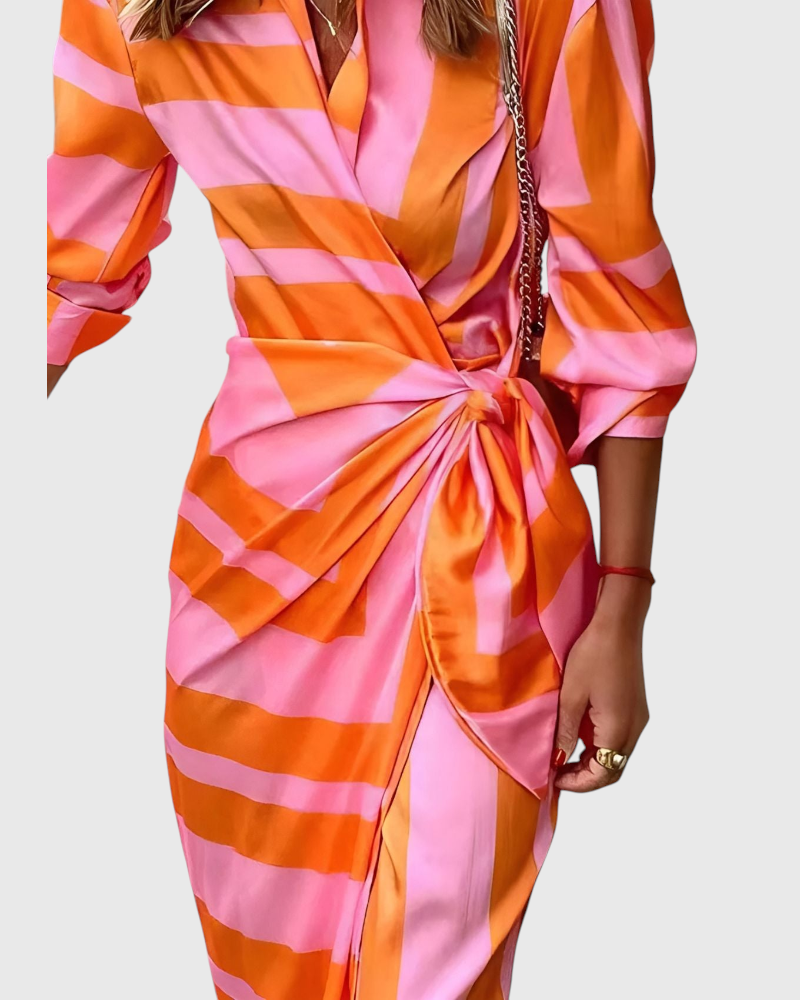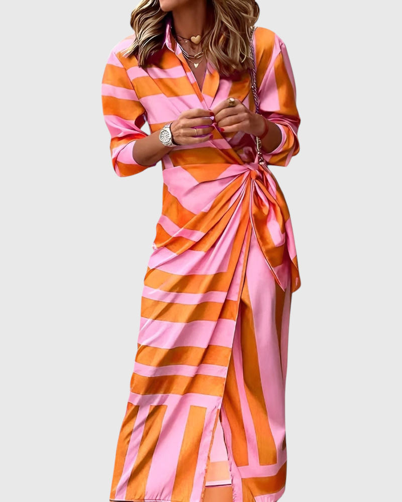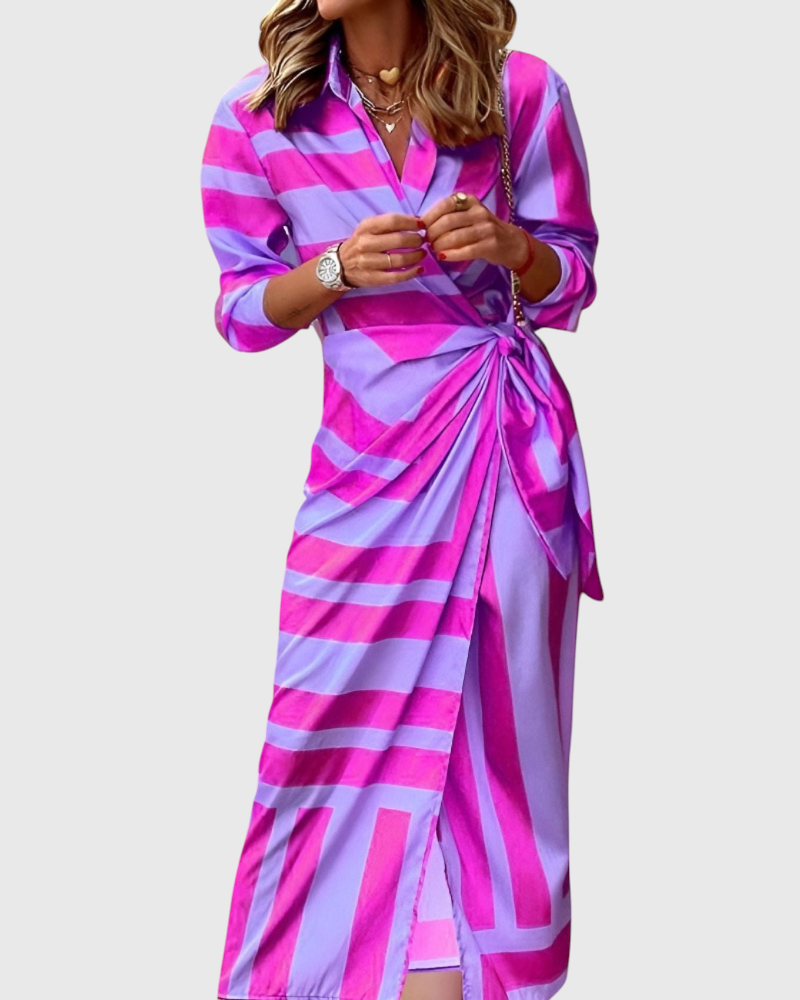 שמלת מעטפת נועזת ומתוחכמת המשלבת נוחות עם סטייל מודרני. הדפס גיאומטרי מרשים וקשירה מחמיאה במותן הופכים אותה לפריט אופנתי מלא נוכחות.