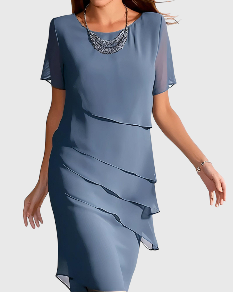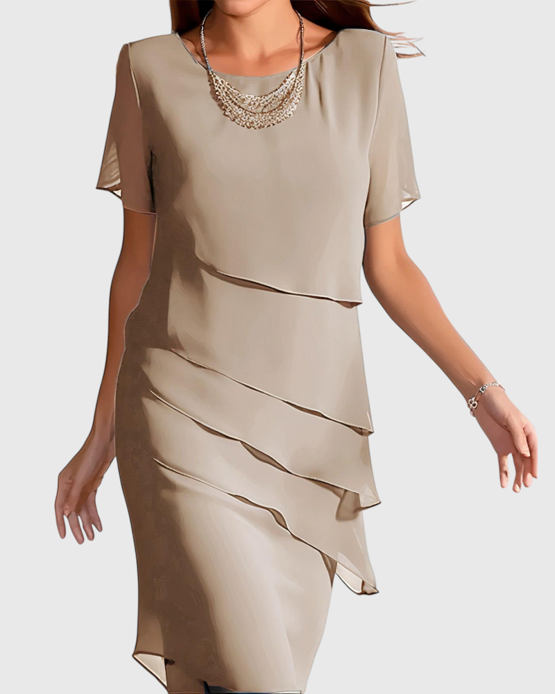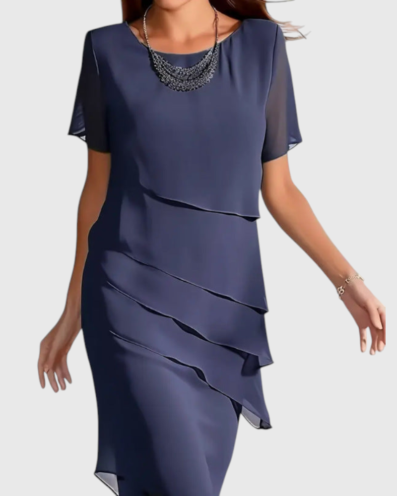 שמלה מתוחכמת עם שכבות מדורגות היוצרות תנועה וחן. בעיצוב אלגנטי ומעודן, היא מתאימה למפגשים רשמיים ולערבים מיוחדים.