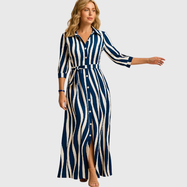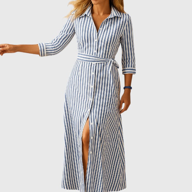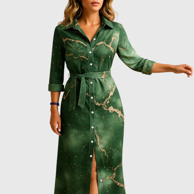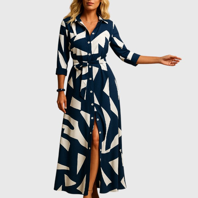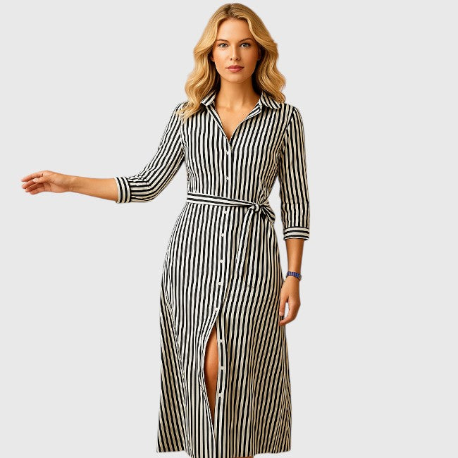 שמלה אופנתית ורב-שימושית המשלבת אלגנטיות עם נוחות יומיומית. עיצוב הכפתורים וחגורת המותן יוצרים מראה מוקפד המתאים לכל הזדמנות.